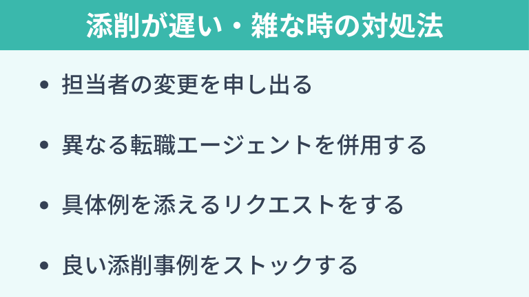 添削の質が安定しなかったり、誤解の多い修正が続いたりする場合は、担当者の変更も検討しましょう。転職エージェント側も、候補者との相性によって成果が変わることを理解しています。そのため、変更の申請は当たり前で、より適切な支援を受けるための前向きな申し出と捉えられることが多いです。
